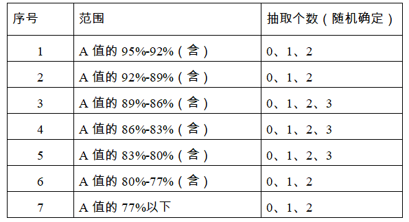 B=在规定范围内的评标价除C值外的任意一个评标价,在评标时随机抽取确定;抽取方式:若评标价在A值的95%及以上范围内,则该类评标价不纳入B值抽取范围;若在A值的95%以下,则按下表随机确定各范围内评标价抽取个数后,抽取规定数量的评标价组成B值的抽取范围。