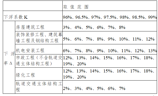 Q2=1-Q1, Q1取值范围为65%、70%、75%、80%、85%;K1的取值范围为95%、95.5%、96%、96.5%、97%、97.5%、98%;Q1、K1值在开标时由招标人随机抽取确定。K2的取值范围,建筑工程为90%〜100%,装饰、安装为88%〜100%,市政工程为 86%〜100%,园林绿化工程为84%〜100%,其他工程88%〜100%。K2值为以上取值范围内的整数值,具体由招标人在招标文件中明确。