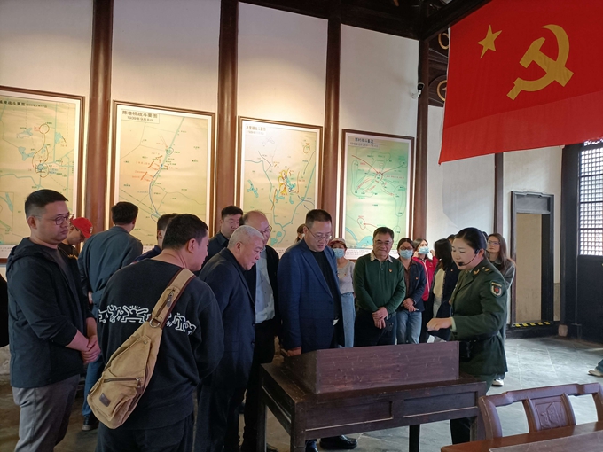 新四军江南指挥部纪念馆位于溧阳市竹箦镇水西村。当天上午,全体党员抵达纪念馆后,前往位于水西村的通讯班旧址、印刷所旧址、司令部副官处旧址、政治部战地服务团旧址,以及新四军江南指挥司令部旧址——李氏宗祠光裕堂参观见学。在一间间朴素的明清风格民居建筑中,支部党员通过视频、实物、诗词等形式,深入了解了新四军队伍与当地群众之间同甘共苦、鱼水情深的军民友谊,生动领略了陈毅、张茜这对革命伉俪的传奇爱情,肃穆庄严地瞻仰了粟裕与夫人楚青合葬墓碑。
