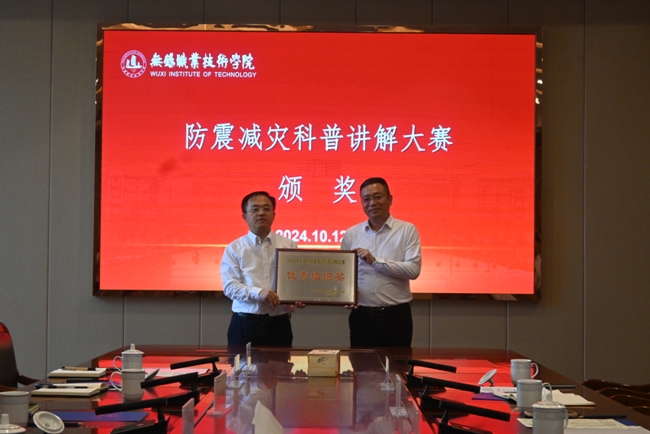 为无锡职业技术学院选派参加省、市防震减灾科普讲解比赛中获奖的选手颁奖,向学院捐赠地震科普书籍、应急物品等,并分发防震减灾宣传资料。