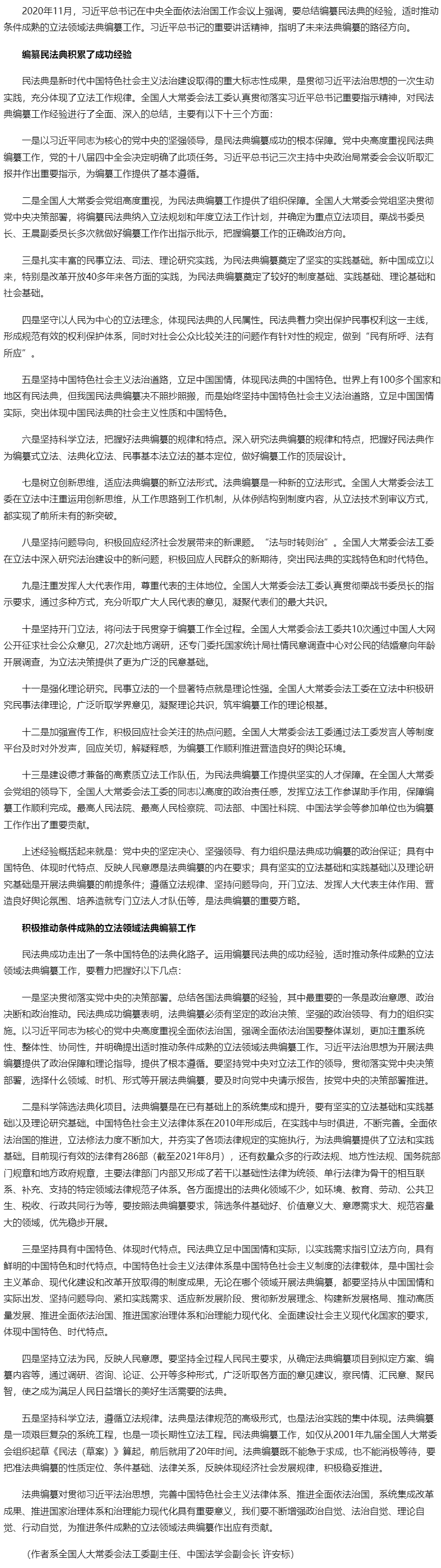 总结编纂民法典的经验 推动条件成熟立法领域法典编纂