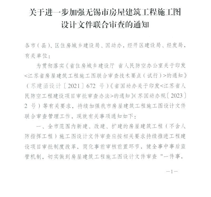 关于进一步加强无锡市房屋建筑工程施工图设计文件联合审查的通知